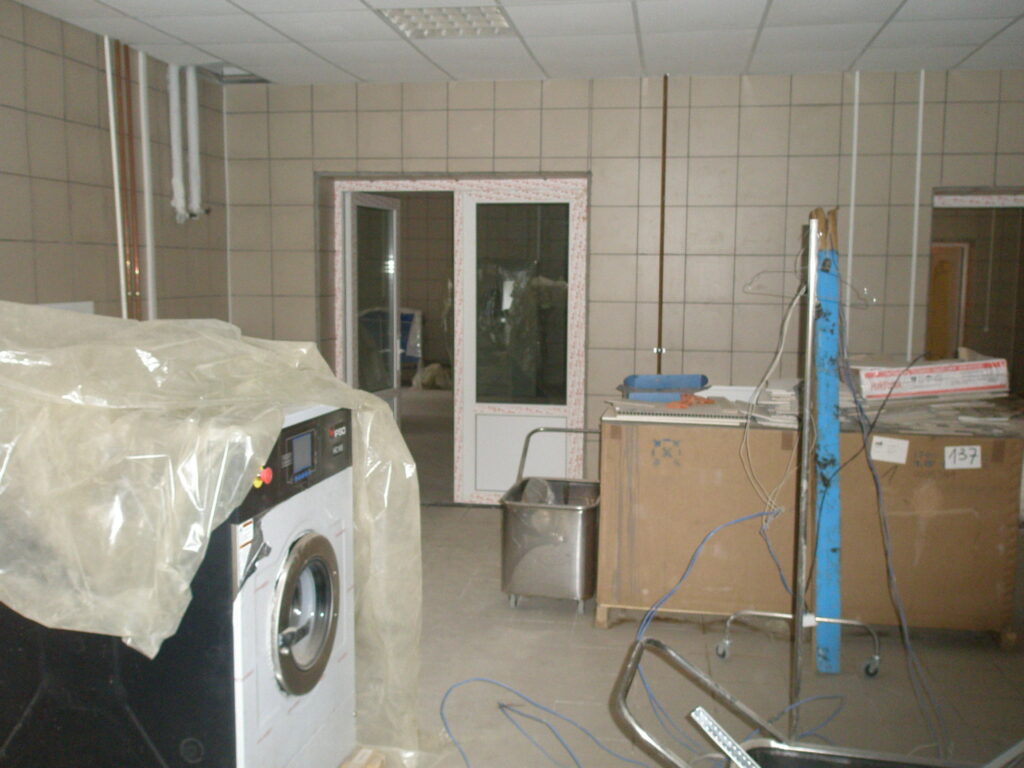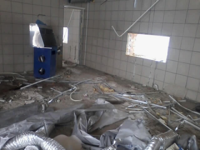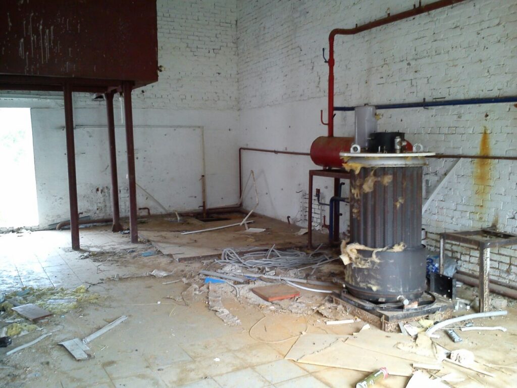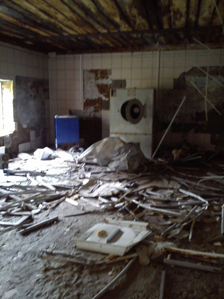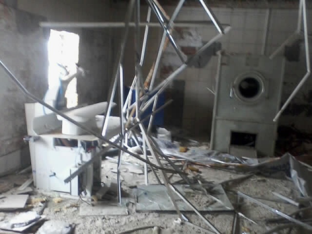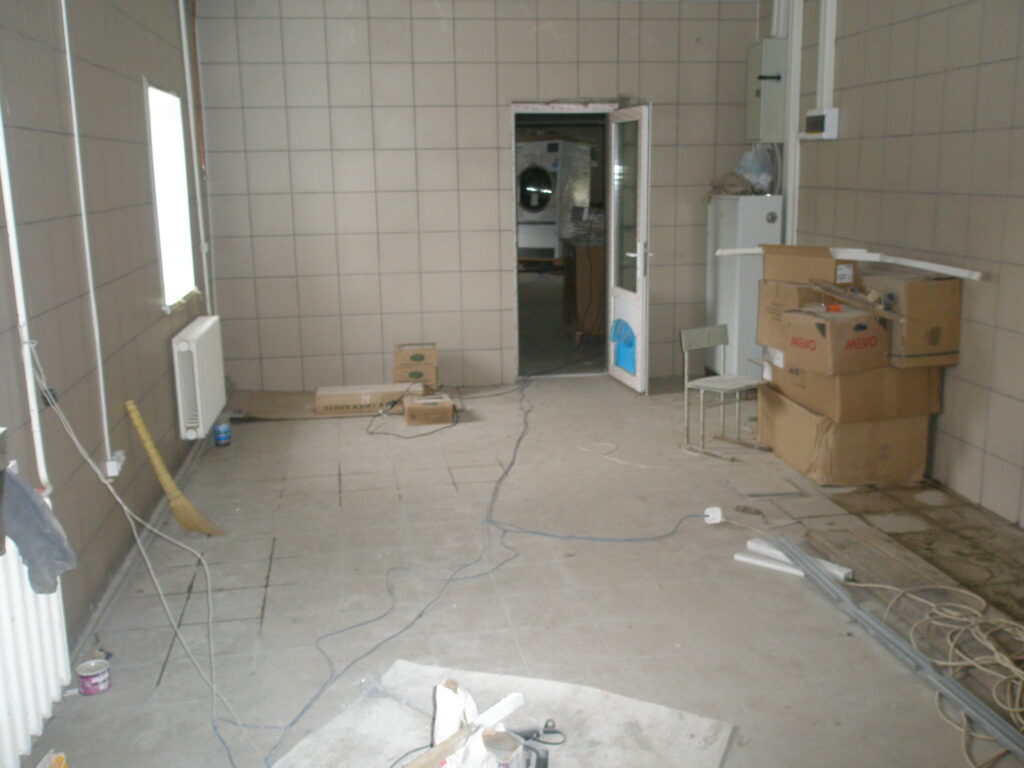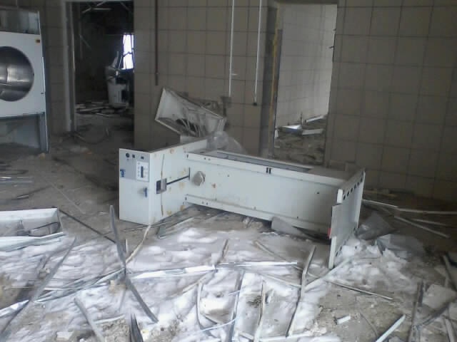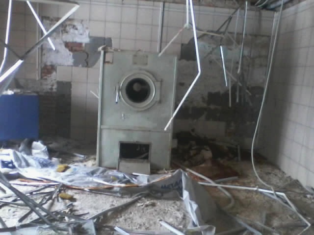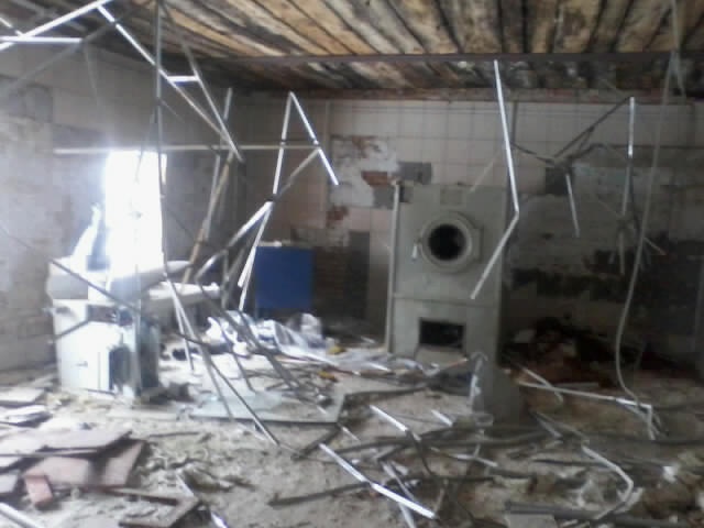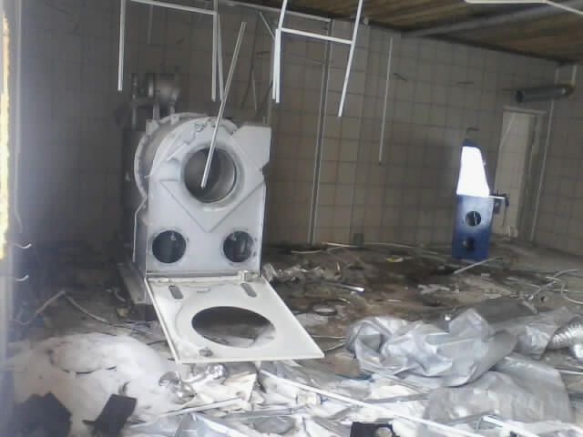 UPD: В 2014 году бандитско-ментовская мафия — видимо, в отместку за мои попытки привлечь их уголовной ответственности — уничтожили фабрику: сняли и вывезли все окна, двери, другое инженерное оборудование. Украли бытовую и сантехнику. Разворовали склад. Оборудование химчистки уничтожили монтировками или обрезками труб. После этого химчистка стала выглядеть следующим образом. Естественно, что мои попытки привлечь виновных к уголовной ответсвенности опять ни к чему не привели — уголовное дело было в очередной раз заволокичено (подробнее читайте здесь).